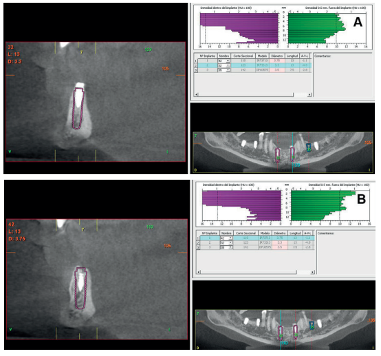 Therefore, it was decided to carry out a sinus lift using biomaterial (bovine hydroxyapatite) bound to PRGFEndoret. The elevation was performed and after five months a new dental cone beam displayed the quantity and quality of the graft obtained for the insertion of dental implants. In the cuts corresponding to the molars of the first quadrant, we observed excellent consolidation of the graft with space to insert 13 mm implants. Today, we would not choose this implant length, since studies published by our group with short and extra-short implants support their use, in addition to showing their diameter is more important than the length to distribute the loads of an already integrated implant; where an 8.5 mm length implant would work in the same way as a 13 mm implant of the same diameter18.
