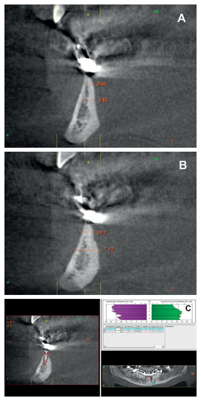 After two months, the dental conebeam showed the perforation had closed completely but the residual bone volume provided 2 mm of bone height only, which was insufficient to insert the implants (Figures 3 and 4).