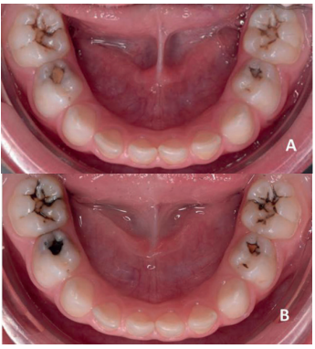 oclusales de los molares temporales. B: Dos semanas después de la aplicación del FDP se observa la tinción oscura de las zonas afectadas.