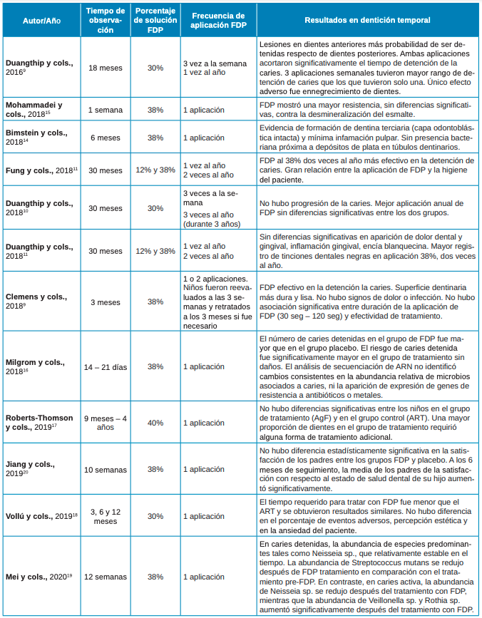 Duangthip y cols.,9,10 publicaron dos estudios aplicando FDP en una concentración del 30% en 2016 y 20181 obteniendo, respectivamente, que las lesiones en dientes anteriores tienen más probabilidad de ser detenidas respecto a los dientes posteriores. En ambos estudios se demostró que la concentración del 30% acortó significativamente el tiempo de detención de la caries9 y no hubo progresión de la misma10 .