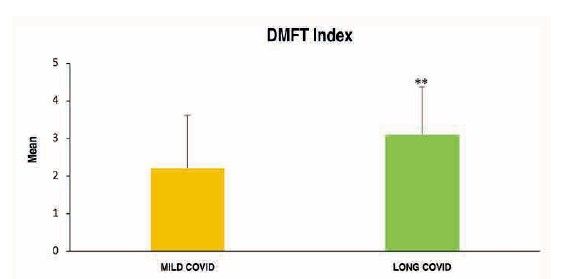 Results: Statistical analysis revealed that Long COVID subjects had significantly higher prevalence of: adenopathies, TMJ pain, pharyngeal irritation, xerostomia, fillings, dental absences and dental crowns, higher CAOM and CAOD index values and higher total dental symptoms. In addition, stress appeared as a risk factor; those patients with Long COVID who presented a higher level of stress (7.73 ± 2.02) were also those who suffered, to a greater extent, from xerostomia or bruxism, responsible for TMJ pain, also more prevalent in this group.