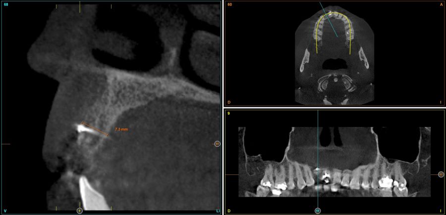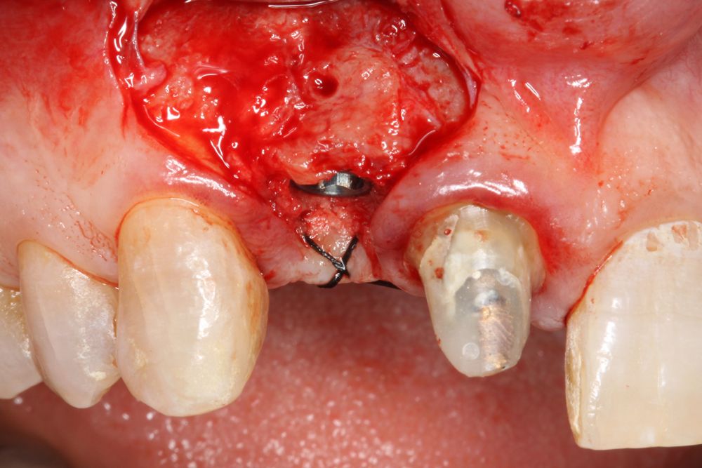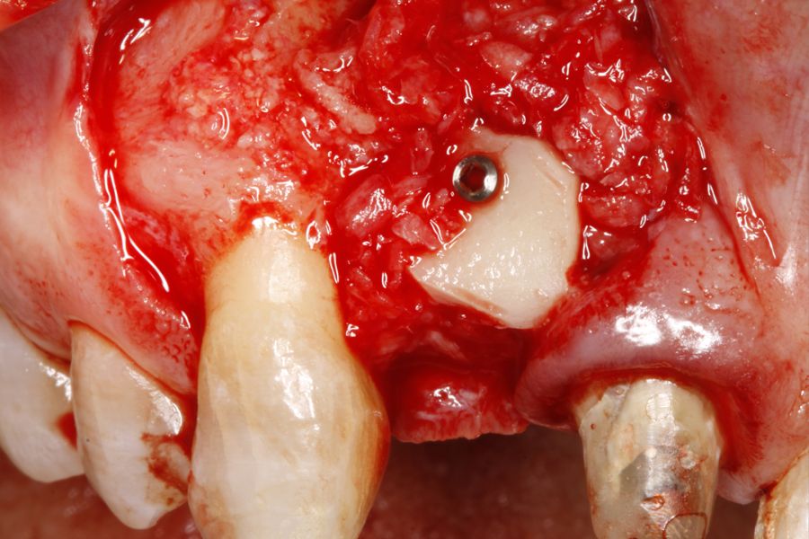 Four months later, a new dental cone-beam is performed to quantify the gain obtained in width with the regenerative procedure. It is observed in the sectional cut that a crest width of more than 7 mm and a complete regeneration of the alveolar ridge has been achieved, allowing the insertion of a new dental implant in the adequate position (Figure 10). In the surgical reentry, the information of the Cone-Beam is verified with a total integration of the graft material, as shown in the clinical images at the time of lifting the flap for the insertion of the implant (Figures 11 and 12). The microscrew is removed and the implant is placed, which is performed by vestibular compression of the graft to gain in this manner even more contour in this area (Figure 13). The implant is left in a surgical phase, with a low healing abutment that allows a subsequent location of the same without an aggressive soft tissue surgery when the construction of the prosthesis is initiated. The provisional crown remains as an extension from the tooth 1.1.