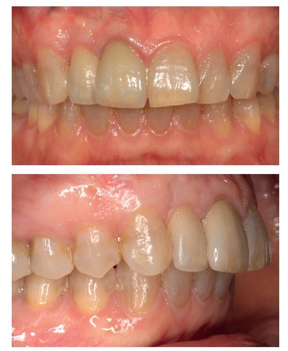 Three months later, the prosthetic phase begins. The state of the gingival tissue is correct, although at vestibular level we would like to achieve a decrease of the zenith of the future tooth, so a connective tissue graft is planned that allows this more appropriate emergence profile conformation. The case ends with E-max crowns at the level of 1.2 and 1.1, achieving a harmonious smile and fully integrated in the rest of the smile, regarding colour, emergence and disposition of the gingival margins (Figures 14-15). The patient continues a follow up for years, maintaining the stability of the performed rehabilitation (Figure 16).