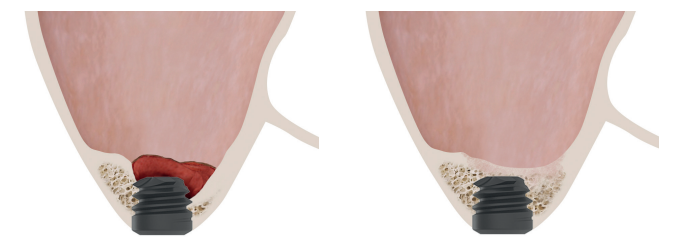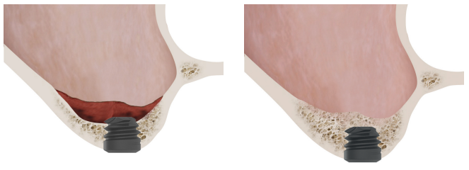 Además, el uso de superficies de implantes bioactivas, que aceleran la formación de hueso en contacto con el sustrato del injerto puede generar una mejora sustancial de los resultados obtenidos a la hora de incrementar la altura de volumen óseo por encima del ápice así como el mantenimiento posterior. La carga que recibe el implante es clave también en el mantenimiento del hueso incrementado. Un mal diseño de la prótesis puede generar que la mejor de las cirugías no tenga éxito. Por eso, el trabajo de prótesis sobre transepiteliales en lugar de directamente al implante, el mantenimiento del hermetismo implante-prótesis y el alejamiento de la zona crítica de unión del implante con la prótesis (con la altura del transepitelial hacia zonas yuxta o ligeramente supra-gingivales) puede hacer que el éxito logrado en la primera fase del tratamiento se conserve posteriormente tras la carga24-25.