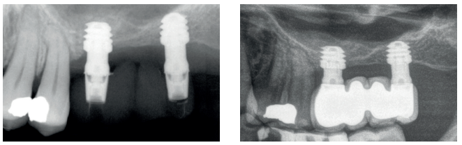 Todos los implantes fueron rehabilitados en dos fases y todos ellos fueron ferulizados a otros implantes en la rehabilitación. En todos los casos se realizó prótesis atornillada de más de un implante con elementos intermedios (transepiteliales), ferulizándose a otros implantes de longitud de 4,5 o 5,5 mm. En todas las situaciones se realizó una prótesis de carga progresiva a los 6 meses de la inserción del implante consistente en una estructura provisional terminada en resina para pasar a una prótesis definitiva metalcerámica. En todos los casos se conservan los transepiteliales iniciales para mantener el hermetismo logrado en la primera fase de la confección de la prótesis.