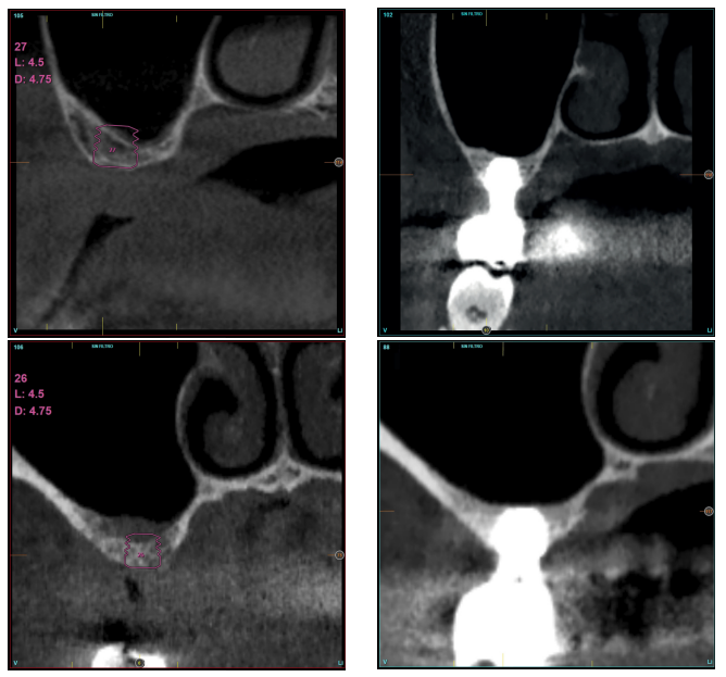 El empleo de una técnica cuidadosa de fresado adaptada al lecho receptor, incrementándose la estabilidad primaria con el diámetro del implante y el anclaje en las corticales vestibular, palatina, mesial y distal (en lugar de buscar anclaje apical), son las claves del éxito de estos trabajos donde se han insertado implantes extra-cortos en alturas residuales menores de 5 mm incluso cuando la densidad residual era baja20-25. Además, en el seguimiento de estos implantes no se ha encontrado una menor tasa de éxito ni complicaciones relacionadas con la escasa altura residual o migraciones de los implantes al seno maxilar20-25.