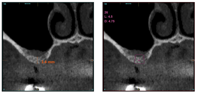 en altura de 3,4 mm, siendo más uniforme en esta ocasión en toda la zona de la cresta. Se planifica un implante de 4,5 mm de longitud y