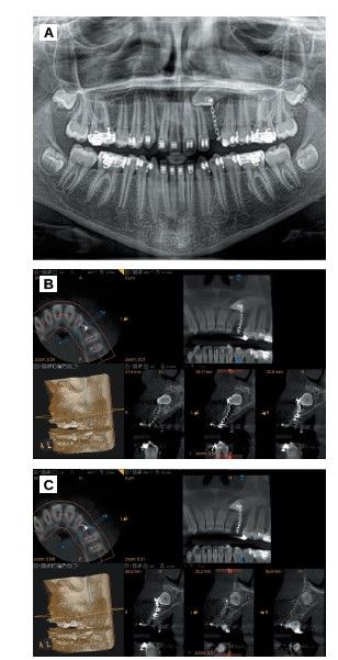 Regarding the adjacent teeth, no resorption of the roots was observed in the radiological tests and the clinical examination showed positive vitality and no discomfort on percussion.