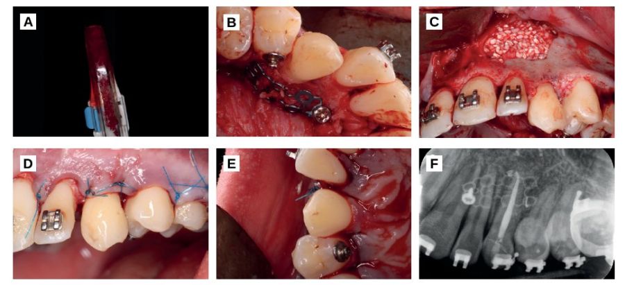 The created space was filled with particulate autologous bone mesh in order to regenerate the area of the tooth that was outside the bone (Figure 3) and the vestibular was regenerated with biomaterial (Apatos, Osteógenos, Madrid, Spain), since it was a self-contained cavity (Figure 3).