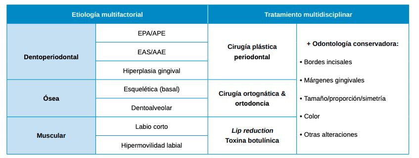 La etiopatogenia de dicha condición se resume en tres facetas: dentoperiodontal (erupción pasiva alterada y erupción activa alterada), ósea (esquelética y/o dentoalveolar) y muscular (labio superior corto e hipermovilidad labial).