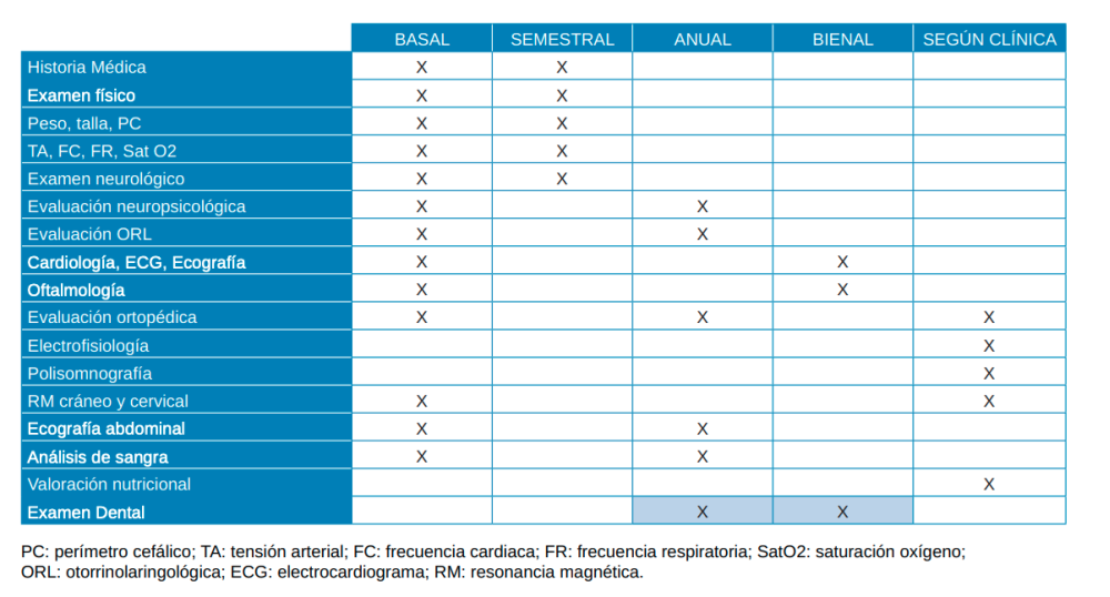 Por lo tanto, se pone de manifiesto la necesidad de un tratamiento y seguimiento multidisciplinar para el control de estos pacientes, en sus diferentes etapas, debiendo establecerse, tal y como se muestra en la Tabla 2, un cronograma de revisiones por especialidades de manera rutinaria para descartar y prevenir problemas que agraven la situación clínica del paciente.