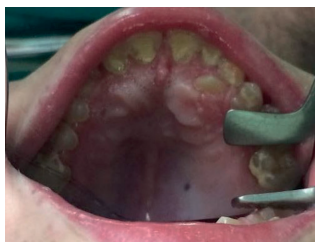 No es frecuente que estos pacientes presenten alteraciones a nivel dentario y gingival como en otros tipos de MPS, pero sí se ha observado una mayor incidencia de bruxismo. Además, pueden presentar dientes supernumerarios con la consiguiente maloclusión que, debido al deterioro del sistema nervioso central desde edades muy tempranas, no puede llevarse a cabo el control por el ortodoncista. En los casos en que, debido a inclusiones dentarias o dientes supernumerarios que provocan patología y se requiere su tratamiento quirúrgico, éste deberá llevarse a cabo bajo sedación25-27 (Figuras 6, 7 y 8).
