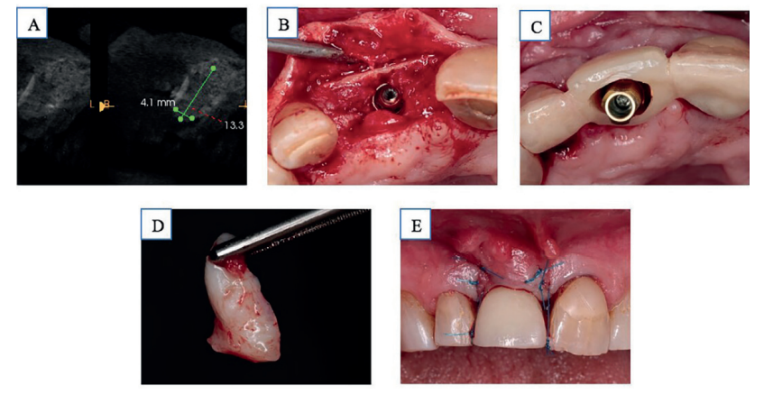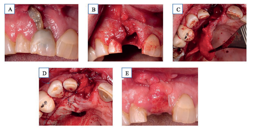Caso clínico: Varón de 54 años que acude a la Clínica Universitaria de la Universidad Rey Juan Carlos con una dehiscencia del tejido blando que sobrepasaba la línea mucoginvival a nivel del incisivo 1.1 cursando con movilidad del fragmento vestibular El paciente no refería sintomatología ni signos patológicos. Se estableció como plan de tratamiento la extracción del diente y aumento del tejido blando mediante la técnica de colgajo rotado de paladar a pedículo posterior. Y posteriormente se realizó la regeneración ósea horizontal mediante SBBT.