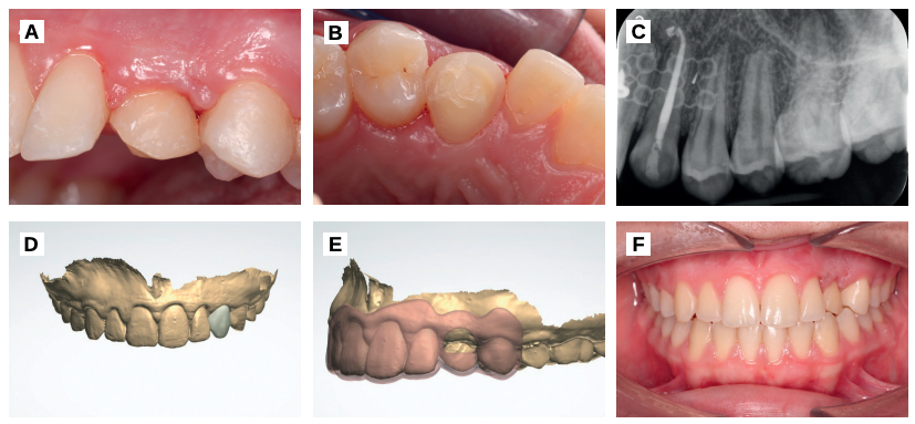 D. Encerado digital. E. Confección digital de férula guiada para alargamiento coronario. F. Post alargamiento coronario.
