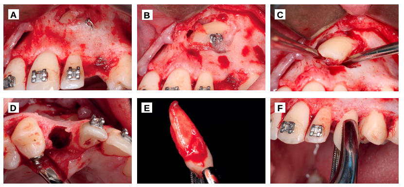 Se realizó la ostectomía en la región crestal con el fin de elaborar un alveolo quirúrgico (Figura 2D) con anatomía similar al futuro canino autotrasplantado mediante el uso de fresas quirúrgicas de implantes de la propia casa comercial (Biomet 3i, Barcelona, España). Se llevó a cabo la exodoncia del diente (Figura 2E) y se transportó al alveolo quirúrgico (Figura 2F). Se llevó a cabo una regeneración ósea guiada en la región vestibular y palatina del mismo, tanto para rodear el diente de un marco óseo favorable como para regenerar el defecto vestibular que quedó tras la extracción del canino.