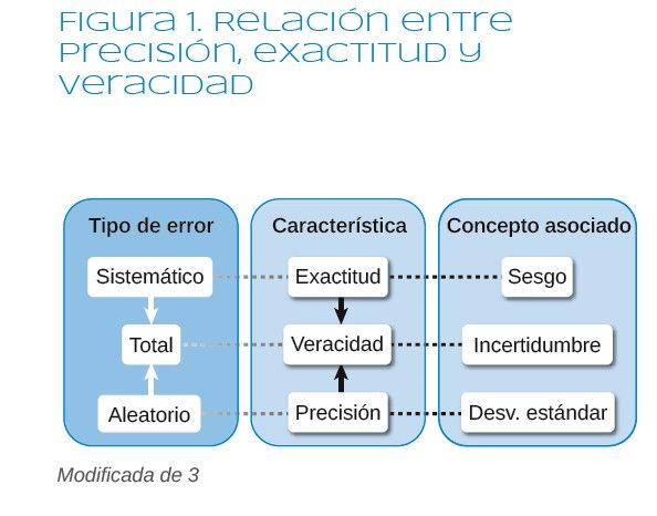 La relación entre la precisión, la exactitud y la veracidad se esquematiza en la Figura 1, modificada de Menditto y cols3.