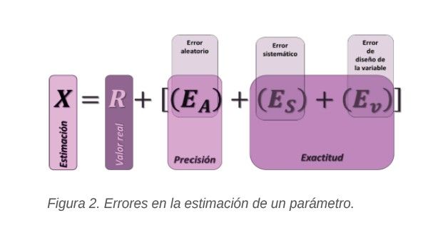 Recordemos también que la estimación de un parámetro desconocido de una muestra (X, Figura 2) es la suma del valor real del parámetro (R, Figura 2), de los errores en la precisión o errores aleatorios (EA, Figura 2) y de los errores en la exactitud, que a su vez son la suma de los errores sistemáticos o sesgos (Es, Figura 2) y de los errores en el diseño de la variable (Ev, Figura 2). Estos errores en el diseño de la variable aparecen cuando la variable no representa adecuadamente el parámetro que queremos encontrar, la característica que estamos estudiando.