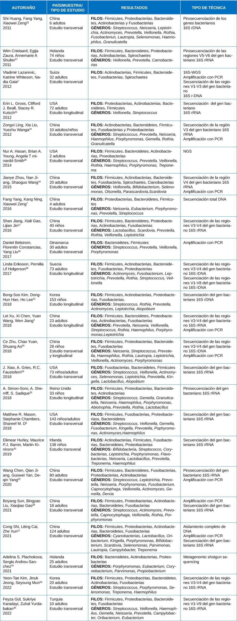 En la siguiente tabla se presentan de forma sintetizada los hallazgos más relevantes encontrados en las bases de datos, en relación con los resultados de análisis metagenómico de la saliva asociado a caries y periodontitis. Se muestra el año del estudio, país, tipo de estudio y se enumeran los microrganismos más abundantes que se encontraron (Tabla).
