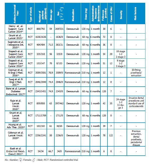 Results: The total number of patients included was 16259. The mean incidence of osteonecrosis cases was 3.87%. There were 51 mild cases of osteonecrosis (stage 1-2) and 16 severe cases (stage 3). The risk factors analyzed were the use of mismatched prostheses, invasive dental procedures, periodontal disease and the use of corticosteroids.