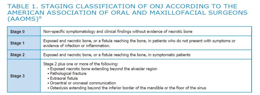 The American Association of Oral and Maxillofacial Surgeons (AAOMS) introduced the staging system to classify the symptomatology of ONJ and facilitate decision-making for its treatment8. (Table 1)