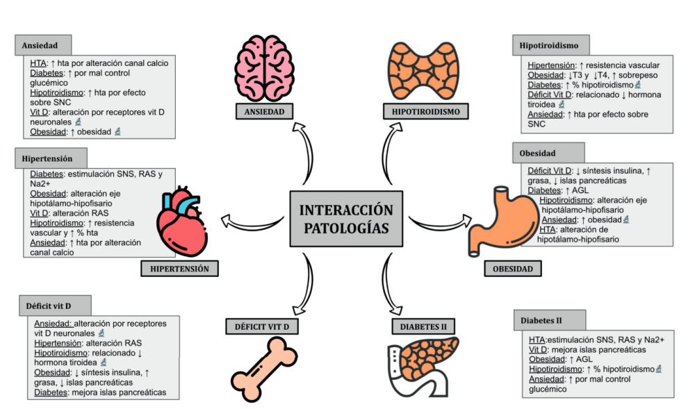 Clinical case: The clinical case of a patient with hypertension, type II diabetes, hypothyroidism, depression, obesity and vit D deficiency is presented. A review is made of the performance of the dentist in the clinic when patients with these conditions appear and the considerations to take into account with respect to the prescription and administration of medication. The objective is to present treatment recommendations based on a clinical case of a patient with several systemic conditions in which a multidisciplinary treatment is carried out. For this, a narrative review has been carried out that is considered useful for daily clinical activity.