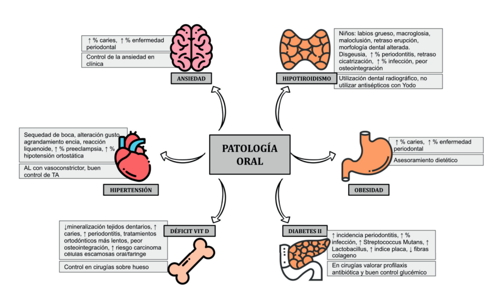 La mayoría de estas condiciones son crónicas y necesitan un tratamiento farmacológico permanente. Además, se suelen encontrar de manera conjunta y el control de una de ellas influye en el control del resto de igual manera que el control de la enfermedad general influye en la salud oral y viceversa2 .