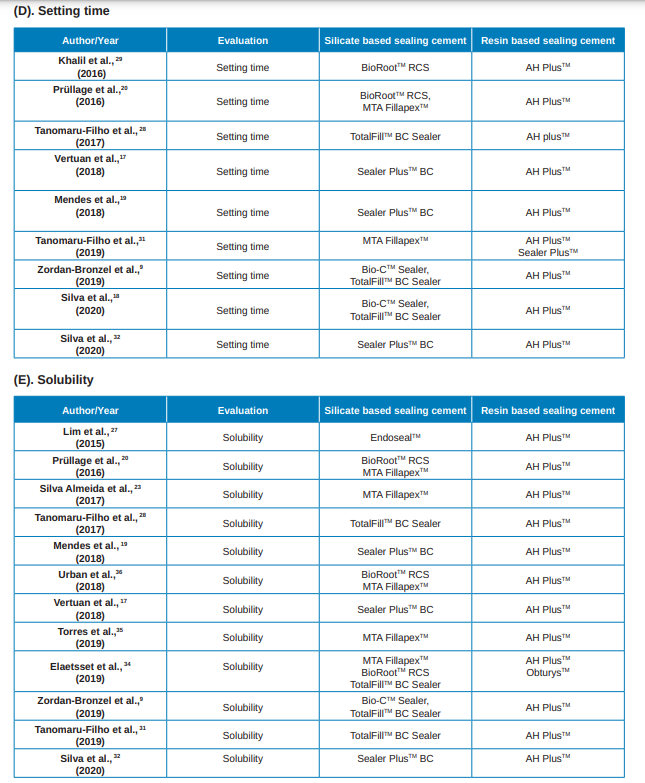 Nor differences were observed in sealing in most of the studies consulted. All the cements analysed presented radiodensity values within the recommended standards. Both the setting time and the solution depended on the type of cement evaluated. Some of the silicate-based cements showed higher solubility compared to resin-based cements.