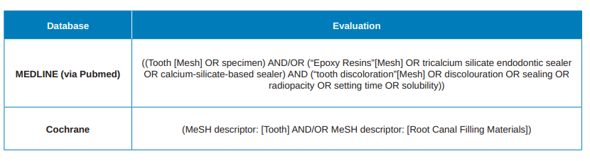In addition, a manual electronic search was carried out. The useful clinical physical properties selected were discoloration, sealing capacity, radiodensity, setting time and solubility.