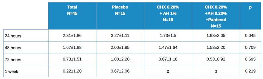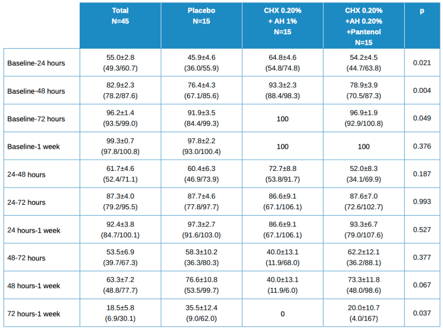 - Baseline vs 48 hours in Test (HA 1%, CHX 0.20%) vs (HA 0.20%, CHX 0.20%, Panthenol); p=0.022.