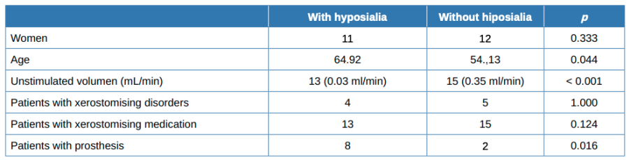 Finally, a greater proportion of patients in the hyposialia group had prostheses (61.5% vs. 13.3%, respectively; p = 0.016) as well as having fewer remaining teeth.