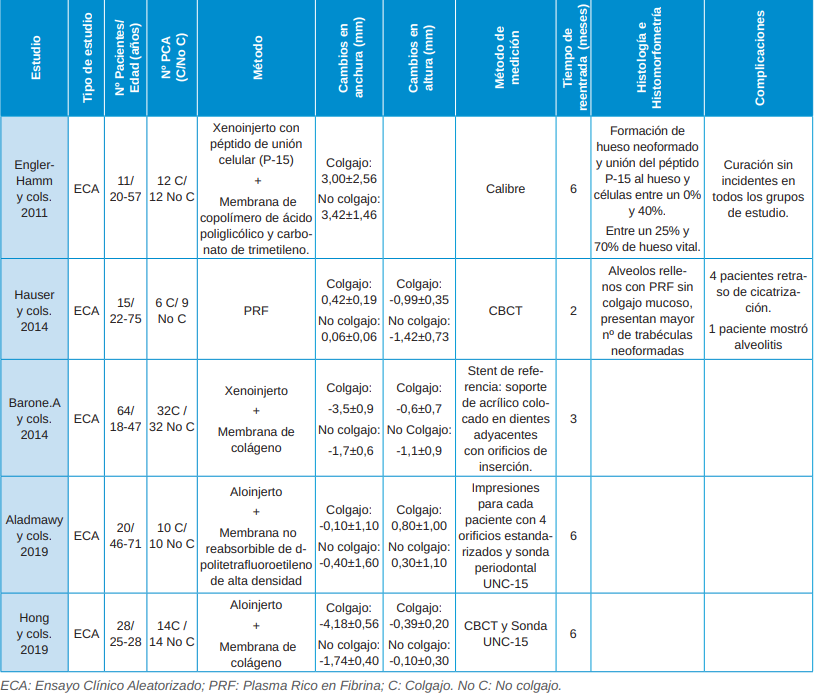 Resultados: Se incluyeron 5 ensayos clínicos de los últimos 15 años en los que se realizó un total de 74 procedimientos quirúrgicos de PCA con colgajo y 77 sin colgajo en 138 pacientes entre 18 y 75 años, cuyo género sólo se describió en 3 estudios. Los cambios óseos en anchura al realizar una PCA con colgajo varían entre –4,18 mm y 3 mm, mientras que al realizar una PCA sin colgajo los cambios son entre 1,74 mm y 3,42 mm. Por otro lado, los cambios óseos en altura al realizar una PCA con colgajo varían entre –0,99 mm y 0,8 mm, mientras que al realizar una PCA sin colgajo los cambios son entre 0,3 mm y 1,42 mm.