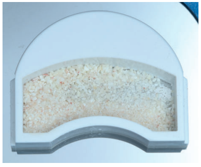 Los fragmentos coronal y radicular se limpiaron de restos de tejidos blandos, y secos, se introdujeron en la máquina Smart Dentin Grinder® (Kometa Bio, BIONER, España). Tras un ciclo de triturado de 3 segundos, y otro de tamizado de 20 segundos, el material obtenido (Figura 3) se limpió con la primera solución durante 12 minutos, y después durante 3 minutos con la segunda solución, para después transportar el material de injerto al alveolo, con presión controlada (Figura 4). Una vez compactado, se colocó una esponja de fibrina (Gelatamp® ) (Figura 5) y se suturó la herida con seda de 4/0, mediante dos puntos simples en la cara distal del segundo molar inferior izquierdo, un punto en cruz en la descarga y un punto en la papila (Figura 6). Se realizó una radiografía periapical intraoperatoria (Figura 7).