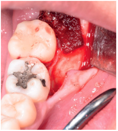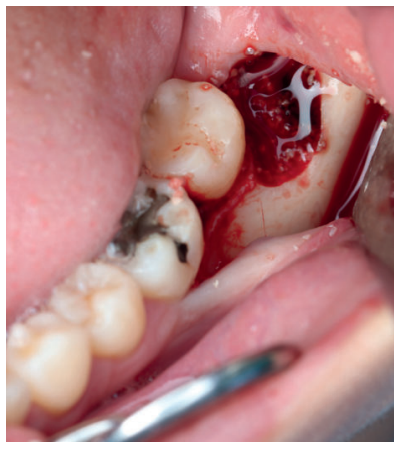 Tras obtener el consentimiento informado, se realizó un bloqueo anestésico mediante Articaína al 4% con adrenalina 1:100.000 del nervio dentario inferior y lingual, y posteriormente el nervio bucal. Se realizó una incisión festoneada lineal desde la cara distal del primer molar inferior izquierdo, hasta la cara distal del segundo molar inferior izquierdo, y se realizó una incisión oblicua hacia la rama ascendente mandibular. Tras el despegamiento mucoperióstico, se realizó una protección del nervio lingual durante las maniobras de ostectomía. Posteriormente se realizó la ostectomía necesaria para liberar el límite amelocementario del tercer molar inferior, procediendo a su luxación mediante botador recto, odontosección coronal con pieza de mano y fresa redonda de carburo de tungsteno, y exodoncia del fragmento radicular una vez retirado el fragmento coronal (Figura 2). El alveolo se lavó con suero fisiológico y se le hizo al paciente morder una gasa estéril empapada en clorhexidina al 0,12%, durante la preparación del material de injerto.