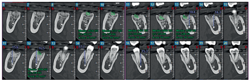 A los 6 meses se realizó una tomografía computarizada de haz cónico (Figura 11), para calcular la densidad ósea en el lado control (1372,33 Unidades Hounsfield) respecto al lado de estudio (1602,33 Unidades Hounsfield). Además, se comparó la altura a la cresta ósea en el lado control (disminución de 2,1 mm de altura ósea) respecto al lado de estudio (disminución de 0,9 mm de altura ósea).