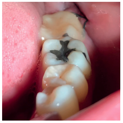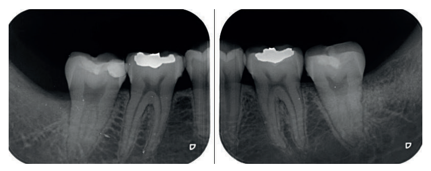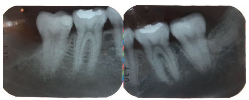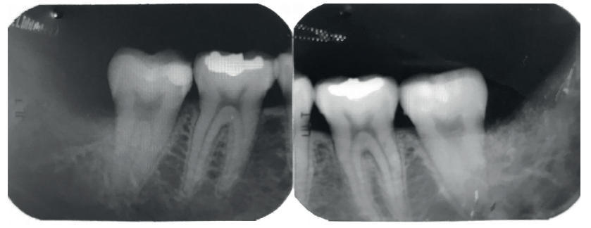 Se realizó la historia clínica de la paciente, que no presentó antecedentes médico-quirúrgicos de interés, alergias medicamentosas conocidas ni hábitos nocivos. En la exploración extraoral, no se apreció ningún dato relevante. En la exploración intraoral, la paciente presentó profundidades de sondaje elevadas en la cara distal de los segundos molares inferiores.