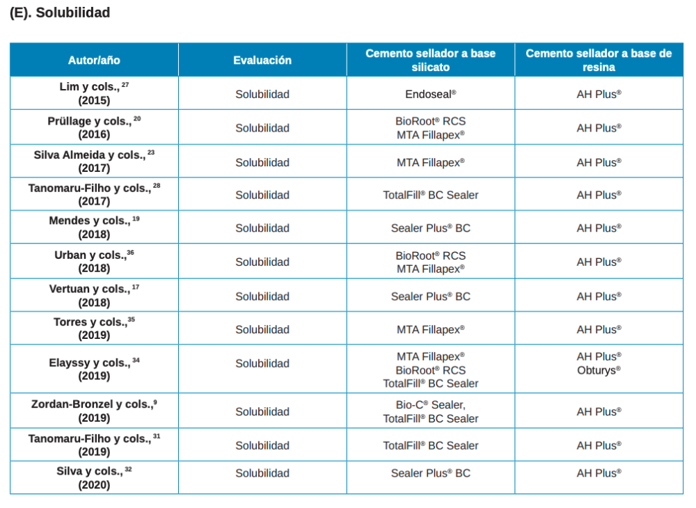 Tanomaru-Filho M, Torres FFE, ChávezAndrade GM, de Almeida M, Navarro LG, Steier L, y cols. Physicochemical properties and volumetric change of silicone/bioactive glass and calcium silicate–based endodontic sealers. J Endod. 2017;43:2097–101.