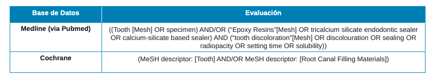 Material y método: Tras establecer la pregunta de investigación adaptada, se llevó a cabo una revisión de la literatura en dos bases de datos (Medline vía Pubmed y Wiley Library vía Biblioteca Chrocane) combinando términos MeSH (Medical Subject Headings) y términos libres. Además, se llevó a cabo una búsqueda electrónica manual. Las propiedades físicas de utilidad clínica seleccionadas fueron la decoloración, capacidad de sellado, radiopacidad, tiempo de fraguado y solubilidad.