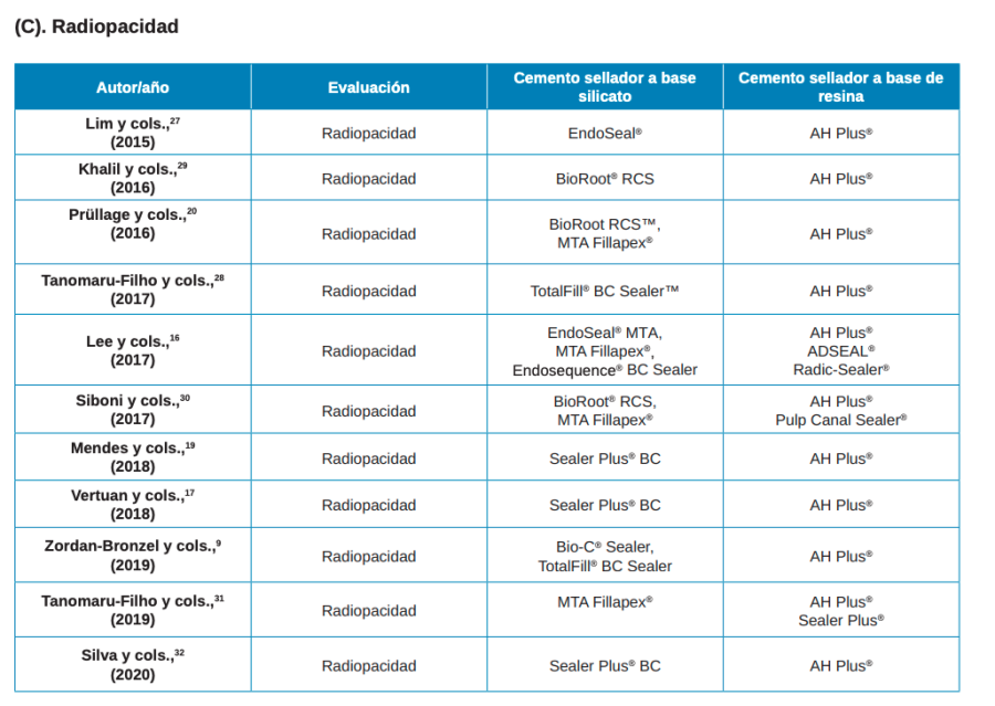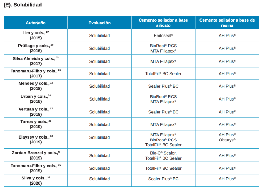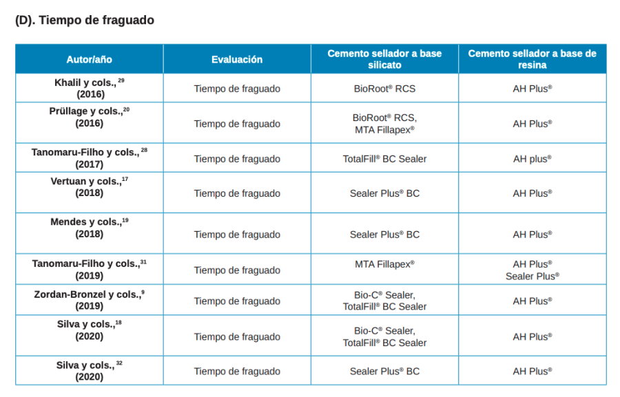 Tanomaru-Filho M, Torres FFE, ChávezAndrade GM, de Almeida M, Navarro LG, Steier L, y cols. Physicochemical properties and volumetric change of silicone/bioactive glass and calcium silicate–based endodontic sealers. J Endod. 2017;43:2097–101.