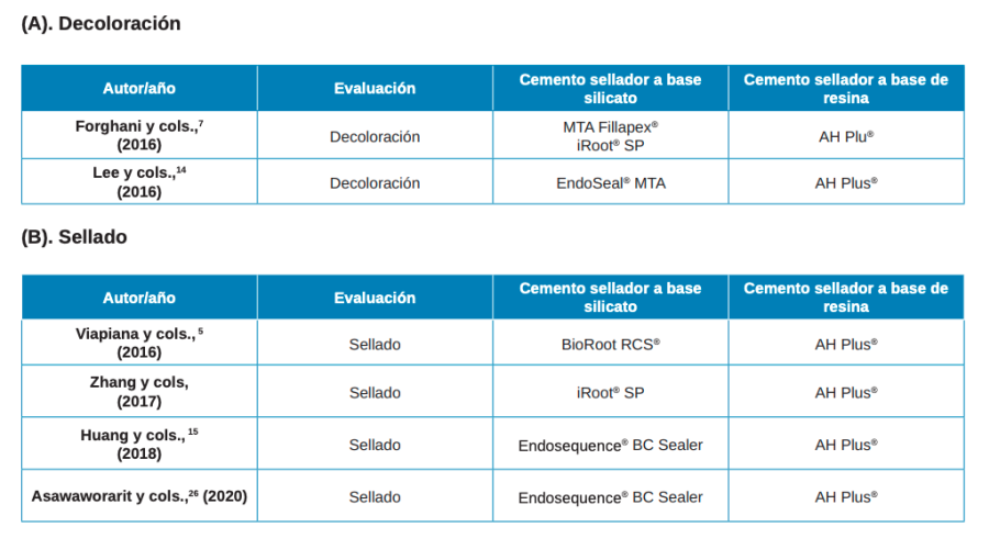 Conclusiones: Entre los cementos a base de silicatos y los cementos de resina, no se observaron diferencias en la decoloración dental. Tampoco se observa ron diferencias en el sellado en la mayoría de los estudios consultados. Todos los cementos analizados presentaron valores de radiopacidad dentro de los estándares recomendados. Tanto el tiempo de fraguado como la solubilidad, dependieron del tipo de cemento evaluado. Algunos de los cementos a base de silicatos presentaron mayor solubilidad en comparación con los cementos a base de resina.