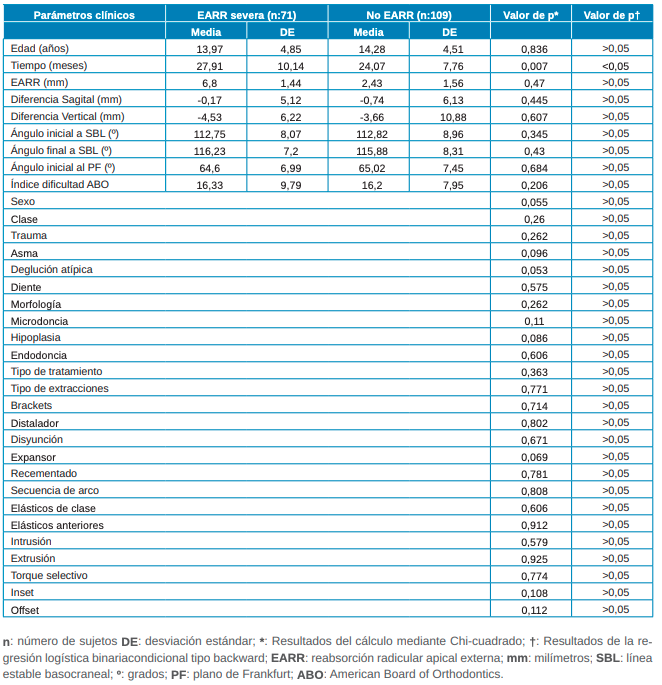 La muestra se compuso de 109 hombres y 131 mujeres, con una media de edad de 14,19 ± 4,61 años, un tiempo medio de tratamiento de ortodoncia de 25,2 ± 8,69 meses y una EARR media de 3,72 ± 2,51 mm. Los resultados del análisis descriptivo se pueden consultar en la Tabla 1.