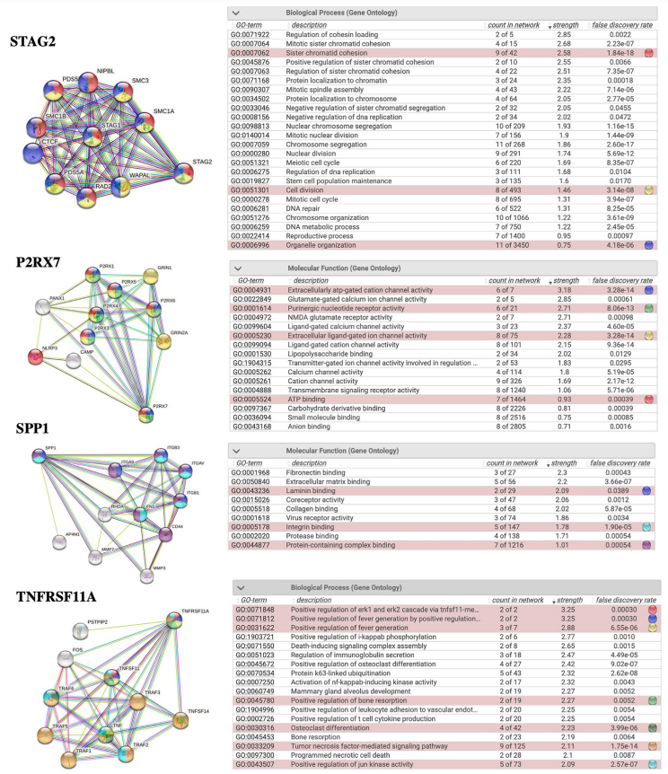Adicionalmente, se relacionaron estas 5 proteínas conjuntamente a través de STRING. En una primera búsqueda simple, no se observó relación directa entre ellas, por lo que se realizó un análisis de cluster en el que se agruparon las proteínas en función de su actividad biológica y se obtuvieron 3 cluster (Figura 3). El primer cluster hace referencia a STAG2 y otras proteínas que se consideran implicadas en la cohesión de las cromátidas hermanas y en el proceso de división celular y nuclear. En el cluster 2 se encontraron implicadas P2RX7 y TNFRSF11A, involucradas en la regulación positiva de la secreción de prostaglandinas, regulación de la reabsorción ósea y respuesta a lipopolisacáridos. En el tercer cluster se encuentra la SPP1, asociada al complejo de contención proteínica (protein-containing complex), que son conjuntos estables de dos o más macromoléculas.