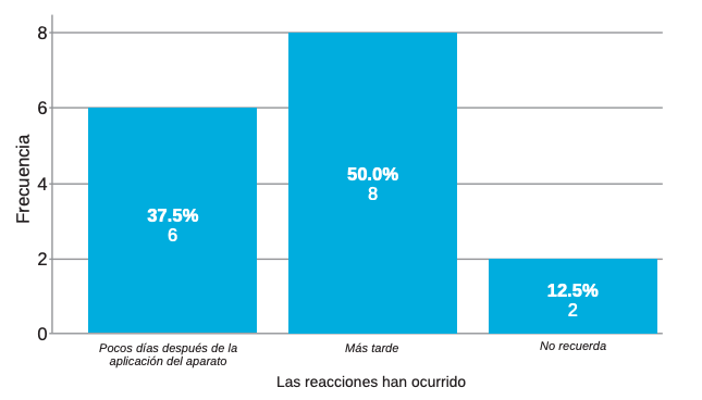En cuanto al plazo/tiempo en que aparecieron estas reacciones adversas (Figura 3), en el 50% de los casos se presentaron cuando ya llevaba un cierto tiempo con el dispositivo intraoral. En un 37,5% de los casos aparecieron las reacciones adversas a los pocos días del contacto con el aparato.