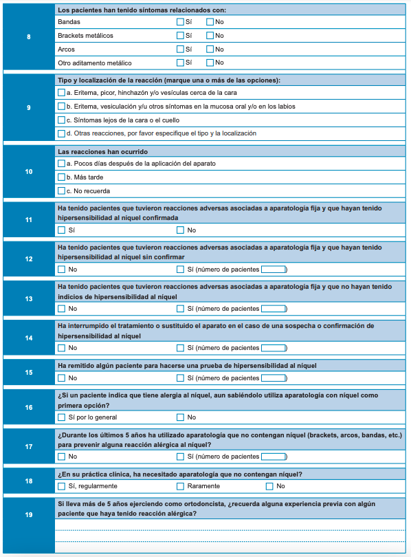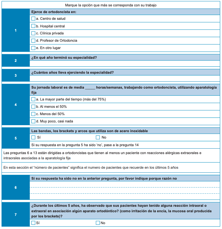 La investigación se llevó a cabo en el Máster Universitario de Ortodoncia de la Universidad Alfonso X El Sabio. Se diseñó un estudio transversal retrospectivo, donde, mediante una encuesta (Tabla), se preguntaba a los especialistas acerca de la aparición de alergias en sus casos de ortodoncia tratados durante los últimos 5 años. Se registró la frecuencia, gravedad y tipo de reacción encontrada, al igual que el tipo de aparato utilizado en aquellos casos donde se registró una reacción alérgica.