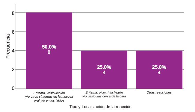 Según el tipo y la localización de la reacción, en el 50% de los casos en los que apareció alguna reacción, se presentó en forma de eritema, vesiculación y/u otros síntomas en la mucosa oral y/o en los labios (Figura 2).