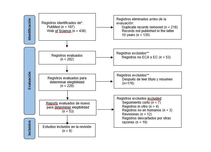 Tras la selección de los artículos por título y resumen, se seleccionaron 53 para su lectura completa. Doce de ellos fueron descartados por ser revisiones sistemáticas; tres por tener muestras no humanas; cuatro de ellos, por ser estudios in vitro; siete, por tener un seguimiento menor de 3 meses; y el resto, por otros motivos. Es decir, solo 8 fueron elegidos para lectura de texto completo y todos ellos fueron seleccionados para el presente trabajo. (Figura).