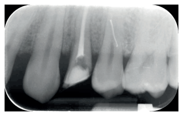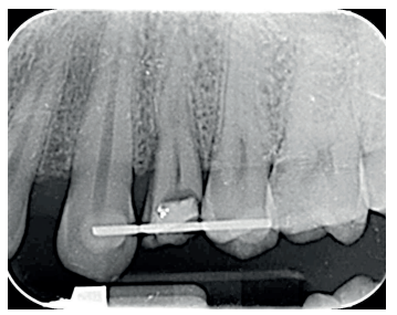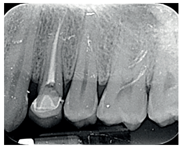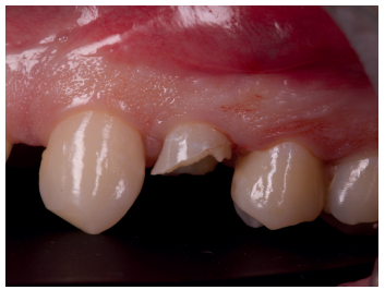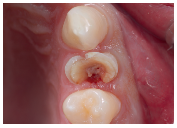 Se presenta en el Máster en Cirugía Oral, Implantología y Periodoncia de la Universidad Alfonso X El Sabio (Madrid, España) un paciente de 24 años derivado para exodoncia del primer premolar superior izquierdo y colocación inmediata de implante debido a una fractura corono-radicular como consecuencia de caries asintomática, con margen distal 2 mm subgingival y limitada estructura remanente (Figuras 1 y 2). Después de un estudio completo del caso, en colaboración con el Máster en Endodoncia de la misma facultad, se planificó la realización de la extrusión quirúrgica, endodoncia y posterior rehabilitación del diente. Dentro de este estudio resultaron de vital importancia las pruebas radiológicas, compuestas por radiografías periapicales y CBCT, que confirmaron la compatibilidad de la anatomía radicular con la realización de una extrusión mínimamente traumática.