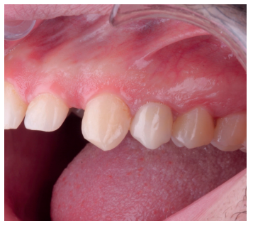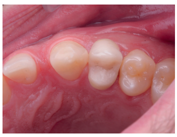 Una vez se hubo posicionado el diente 2 mm supragingival, se procedió a la ferulización con alambre de acero a los dientes adyacentes (Figuras 3 y 4) y la eliminación de cualquier tipo de oclusión, utilizando topes oclusales en los segundos molares inferiores. La ferulización se mantuvo durante dos semanas, coincidiendo con el momento de la endodoncia (Figura 5). El paciente fue citado para las revisiones periódicas y posteriormente para la rehabilitación del diente, una vez hubieron concurrido 6 semanas desde la extrusión, en las que se haya obtenido una cicatrización de los tejidos de soporte supracrestales10. En este momento, tras comprobar signos clínicos, periodontales y radiográficos saludables, se citó al paciente para el tallado y la confección mediante flujo digital (Cerec® System) de una endocorona de disilicato de litio (e.max®, Ivoclar Vivadent). El acondicionamiento de la corona se realizó con ácido fluorhídrico y silano, y para la cementación se utilizó cemento de resina (Calibra®, Dentsply Sirona).