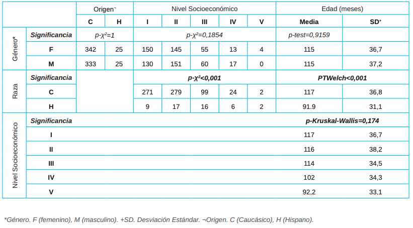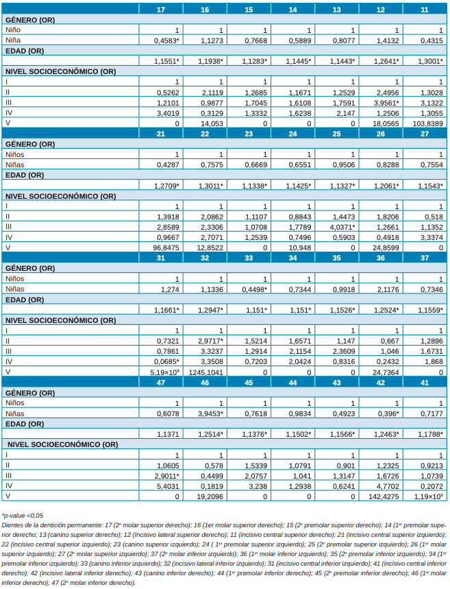 Resultados: Con respecto al nivel socioeconómico un 38,62% eran de nivel I, el 40,83% nivel II, el 15,86% nivel III, el 4,14% nivel IV y el 0,55% nivel V. El primer diente en aparecer en el maxilar fue el primer molar (74,34-76,41%), mientras que en la mandíbula fue el incisivo central (78,9-82,76%) con diferencias estadísticamente significativas (p-χ2 <0,001).