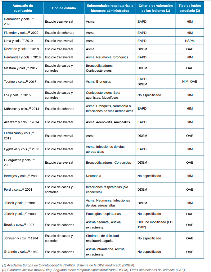 En contraposición, un único estudio por Jälevik y cols.27 observaron que no existía relación entre alteraciones del esmalte y condiciones médicas del aparato respiratorio en los dos primeros años de vida de un grupo de niños de 6 a 8 años, que fueron encuestados tras recibir extracciones dentarias de sus primeros molares por hipomineralizaciones severas.