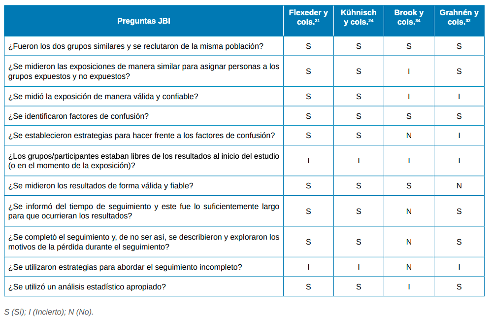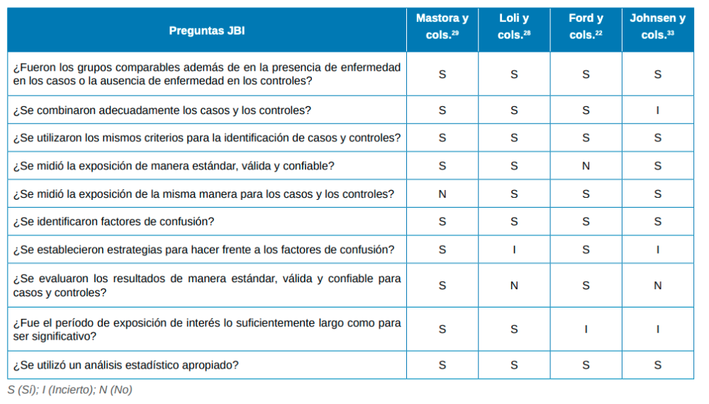 El riesgo de sesgo fue evaluado mediante la herramienta de evaluación del Instituto Joanna Briggs (JBI)15. Esta herramienta fue aplicada a los estudios de cohortes (Tabla 2) y de casos y controles (Tabla 3).
